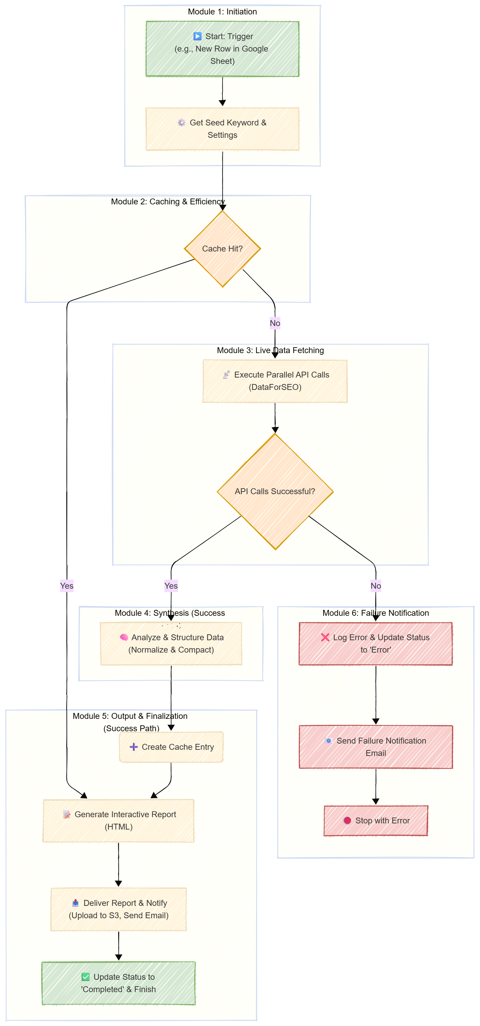 🔄 The Zero-Waste Caching Engine: True automation is efficient. The integrated caching layer checks for existing research before every run, delivering instant results on repeat queries and saving you significant DataForSEO API costs.